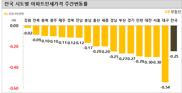[전세 전국] 전세가격 전주 대비 -0.25%로 하락