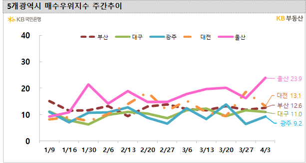 서울의 매수우위지수는 지난 25.5보다 조금 높아진 28.5를 보이면서 침체 상태가 지속되고 있다. 인천(20.4)을 제외한 5개 광역시에서는 울산(23.9)이 가장 높다. 대전 13.1, 부산 12.6, 대구 11, 광주 9.2로 100 미만의 '매도자 많음' 상황이다.