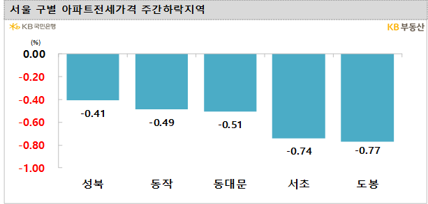 서울 전세가격은 -0.30% 하락했다. 도봉구(-0.77%), 서초구(-0.74%), 동대문구(-0.51%), 동작구(-0.49%) 등 모든 지역이 하락을 보였다.