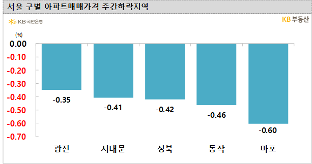 서울 아파트 매매가격 변동률은 -0.24% 하락을 기록했다(-0.29%(3/13) → -0.28%(3/20) → -0.26%(3/27) → -0.24%(4/3)). 마포구(-0.60%), 동작구(-0.46%), 성북구(-0.42%), 서대문구(-0.41%) 등의 하락폭이 크고, 대부분의 지역이 하락하였다.