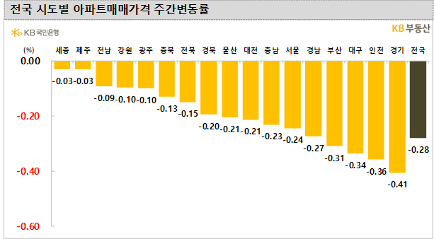 전국 아파트 매매 전주 대비 -0.28%, 전세 -0.25% 하락, 서울 매매는 -0.24%